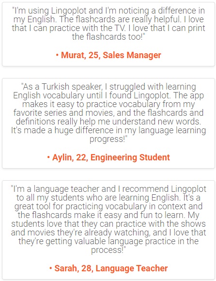 • Murat, 25, Sales Manager"As a Turkish speaker, I struggled with learning English vocabulary until I found Lingoplot. The app makes it easy to practice vocabulary from my favorite series and movies, and the flashcards and definitions really help me understand new words. It's made a huge difference in my language learning progress!"